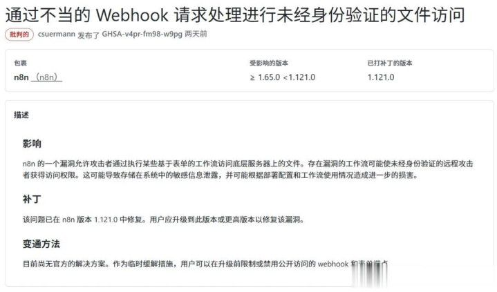 n8n 指出:“目前没有官方的解决方法。作为临时缓解措施,用户可以在升级之前限制或禁用公开访问的 webhook 和表单端点。”