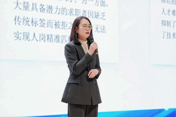 (图:钉钉AI咨询研究院的副院长翟欣介绍“AI人才库”)