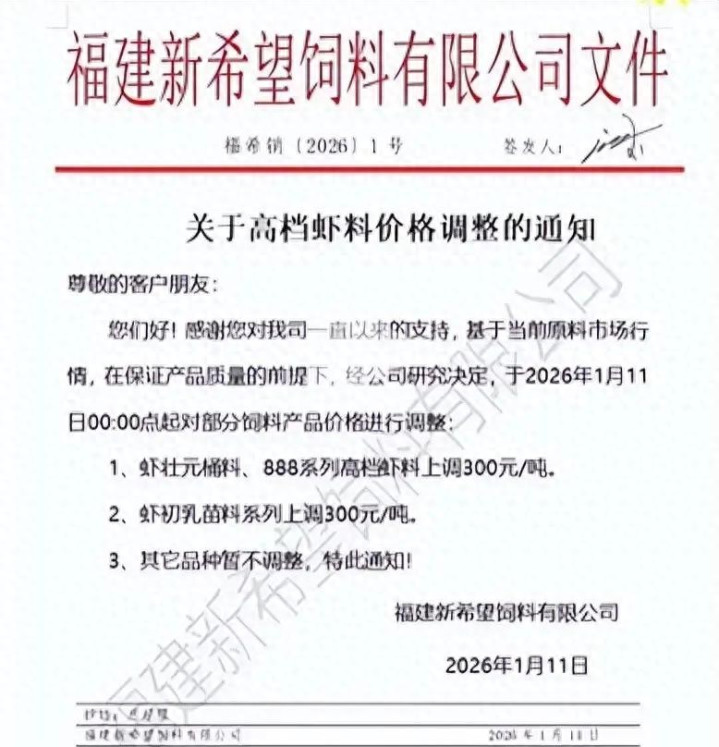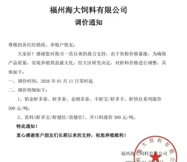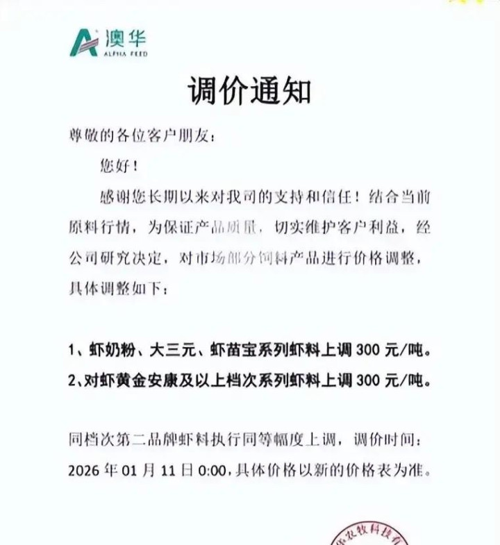 从2026年1月10日晚上开始,国内的部分知名饲料企业相继公布了调整虾料、虾苗料价格的通知,从2026年1月11日零时开始,每吨价格上涨300元,本次上涨也牵动了行业里的主打企业,基本包括了海大、通威、新希望、澳华这些国内业界巨擘。相关企业表明涨价因素归咎于大部分生产饲料的原材料之一,也就是鱼粉价格持续上涨导致成本提高,企业就是为了在一定程度上稳定产品品质并且考虑到养殖的盈利诉求,这一阵发行情势很可能延长一段时间更多饲料企业跟风而上。