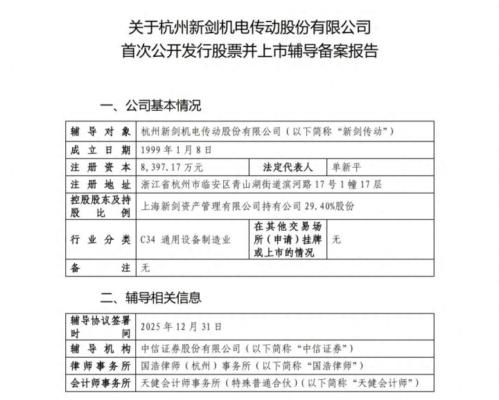 辅导备案报告显示,新剑传动成立于1999年,行业分类为C34通用设备制造业。上海新剑资产管理有限公司持有新剑传动29.40%股份,为其控股股东。根据规划,辅导人员将于2026年4月至2026年5月,对新剑传动是否达到发行上市条件进行综合评估,协助新剑传动按相关规定准备首次公开发行股票并上市申请文件。