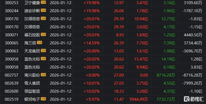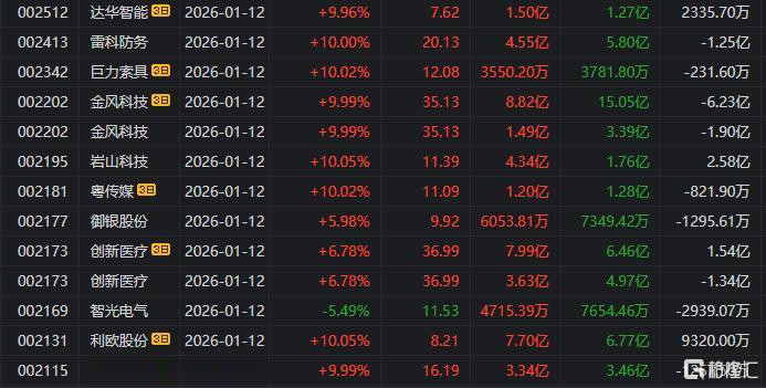 高位股方面,实控人变更的嘉美包装17天13板、锋龙股份12连板,商业航天概念股鲁信创投12天10板、雷科防务9天7板、金风科技11天7板,AI应用端的志特新材20CM6连板。