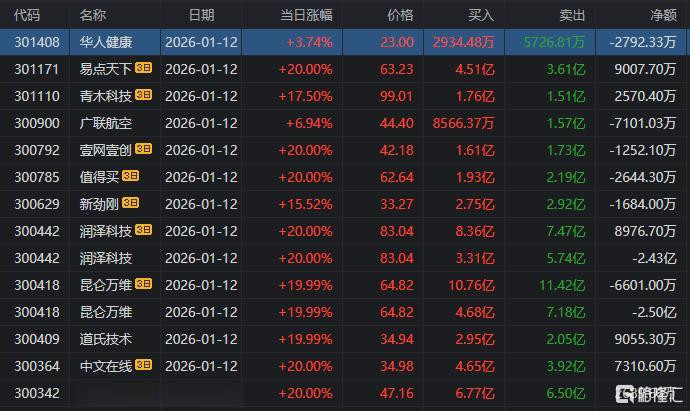 龙虎榜中涉及机构专用席位的个股中,当日净卖出额前三为昆仑万维、润泽科技、蓝色光标,分别为5.36亿元、3.08亿元、2.84亿元。