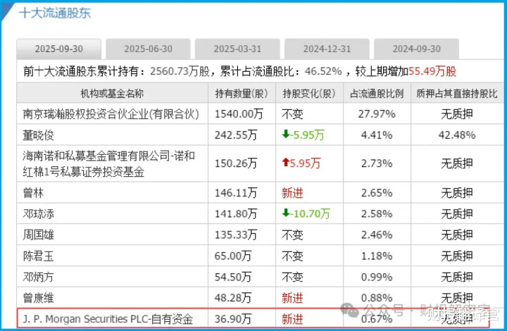 就在这时,开云app一份关键的“证人名单”——前十大流通股东名录——被送抵。一个名字让整个案件升级:J. P. Morgan Securities PLC-自有资金,于三季度新进成为前十大股东。