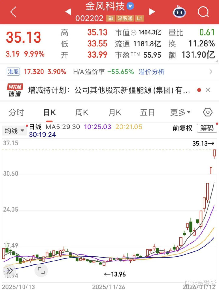 1月12日,风电龙头金风科技股价再次涨停,报收35.13元/股,市值1484.3亿元。