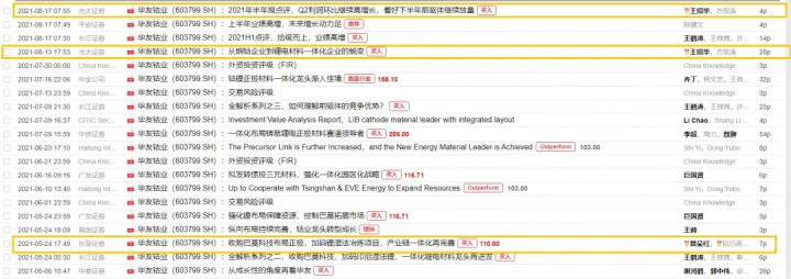 2021年华友股价见顶前后的一些卖方点评报告